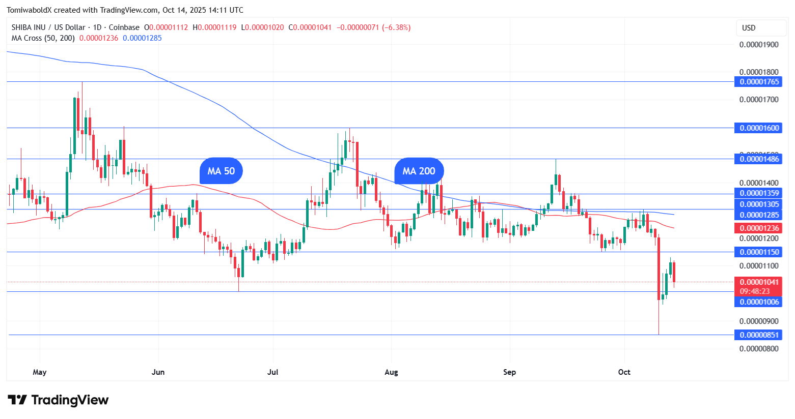 当前价位对柴犬币而言至关重要——若继续下跌,其价格恐将再添一个零,下探0.00000959美元,甚至触及10月10日暴跌时形成的0.0000085美元底部。