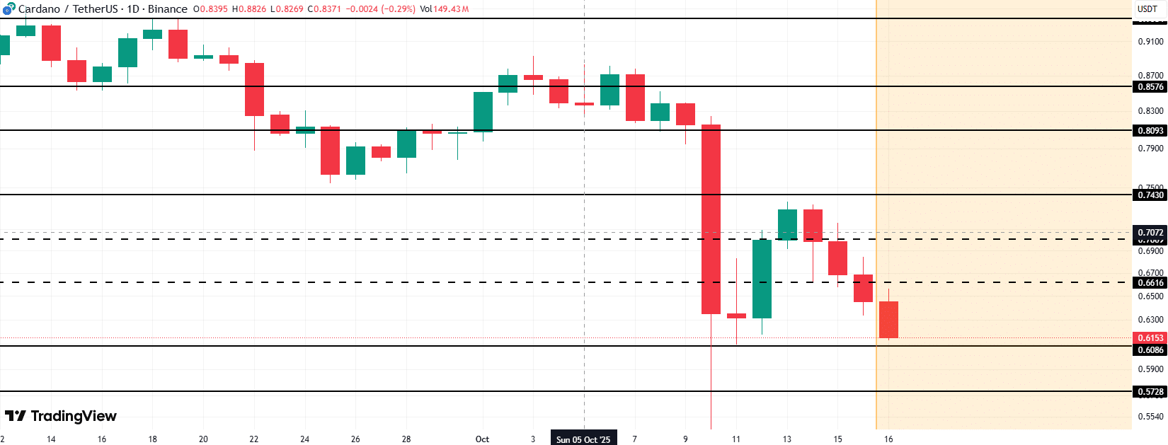 截至撰稿时,ADA报价0.62美元,日线即将收出第四根阴烛。该价位与分析师Dan Gambardello的早前预测吻合——上周趋势线下方遭拒后,他预判了此次下跌行情。