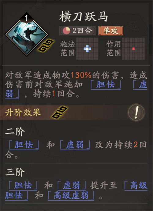 3阶给了重要的减益buff的效果翻倍,可惜必须升迁6才能获得,夏侯惇不是很推荐去补亲兵,可以根据自己需求决定培养进度。