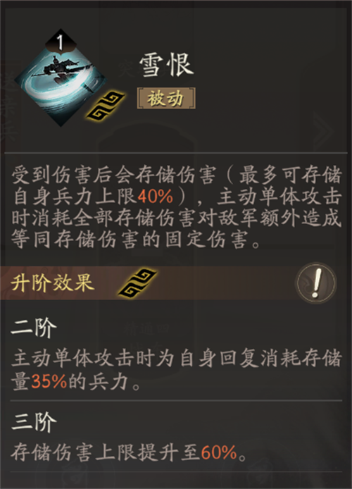 3阶针对发动攻击的目标提高了倍率,因为反击伤害越高<攻心>效果也就越高,实际上是偷偷提升了回复量,但是要注意<攻心>的上限是敌军的残余兵力值,说通俗点就是,有血才能吸,不能虚空吸血。