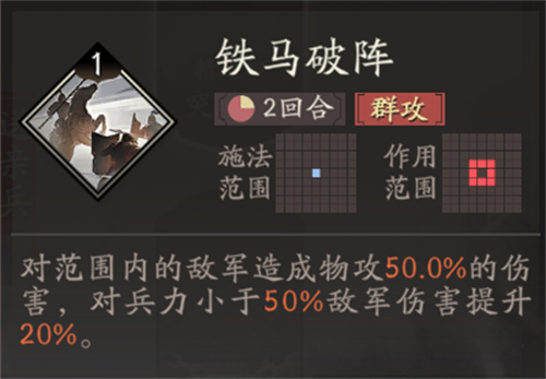 范围攻击效果可以期待,特别是可以主动触发韩浩的天赋,可惜本技能在突骑兵线,学习需要一定成本,低氪金度玩家不推荐开启。