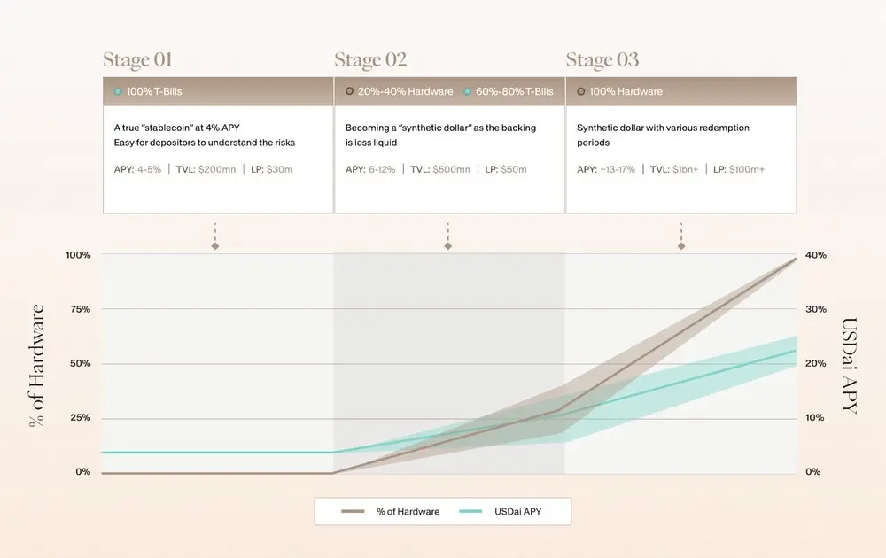 在协议最终成熟的状态下,其储备资产将主要由硬件支持的贷款构成。这将为 sUSDai 持有者带来高年化收益率( 13%-17%+ ),但同时也意味着该代币将作为一种完全合成美元来运作,其赎回周期更长、更具可变性,并高度依赖 QEV 机制来管理流动性。