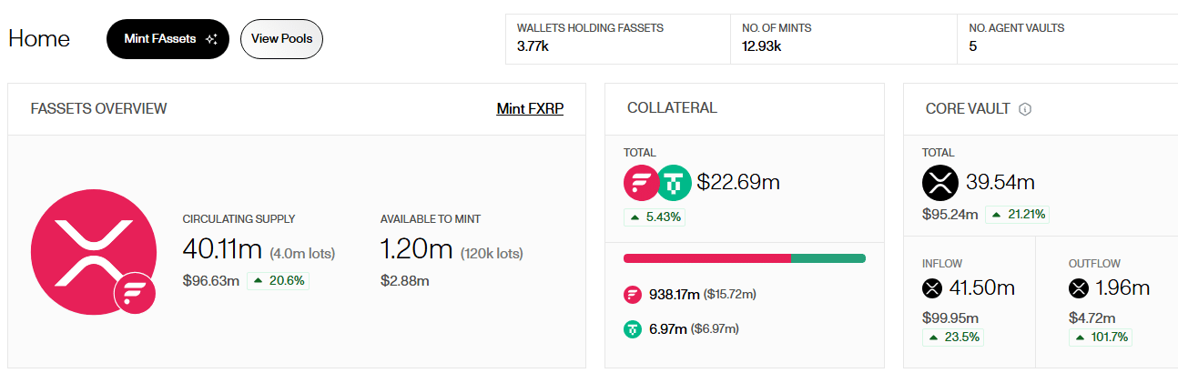 Flare FAssets仪表板最新数据显示,Flare金库目前持有约3954万XRP(价值9854万美元)。值得注意的是,用户已累计铸造4011万FXRP(价值9663万美元),这些代币通过12,930笔交易生成,当前FXRP独立持有者达3770人。