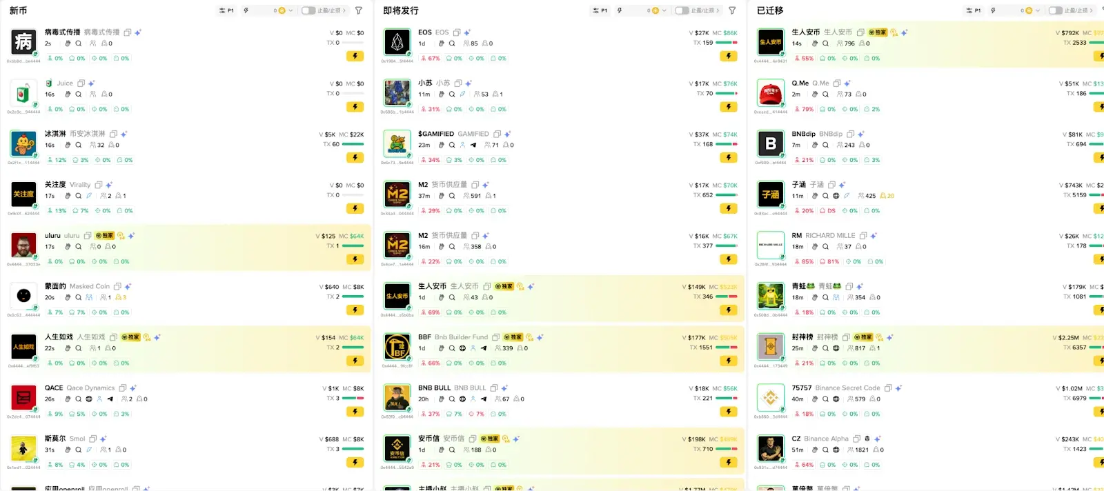那么,我们该如何利用 Meme Rush 来寻找和参与早期的Meme项目呢?其界面通常分为三个核心区域,代表了项目的不同阶段:新币、即将发行、已迁移。
