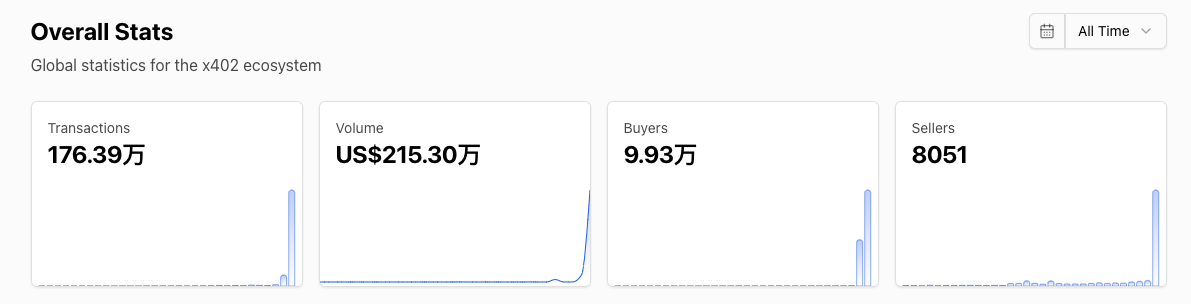 x402 也有同样的问题,AI 自主支付的叙事固然性感,但 现在真的是被用户认可的“对的时间”吗 ?根据 x402scan 数据 ,x402 协议生态总支付量仅 215.3 万美元,服务买家仅 9.93 万,支持付费服务的卖家仅 8051,而目前 x402 协议的总体市值已经超 80 亿美元,这是一个由不到 10 万用户支撑起的市场,市值与真实使用已经严重脱钩。