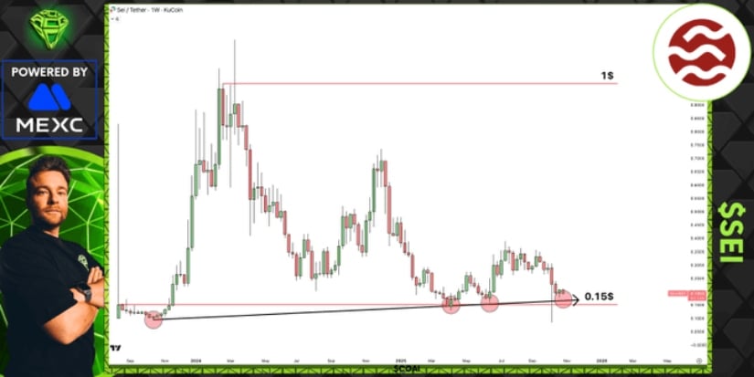AltCryptoGems分析师Sjuul在X平台指出,该资产正在周线图上测试长期上升趋势线,该位置历来是强劲需求区。SEI现报0.15美元附近,似乎正在捍卫这一曾多次引发显著上涨反应的历史支撑位。Sjuul强调此前每次触及该支撑后均出现持续性反弹,突显其对维持整体看涨结构的重要性。