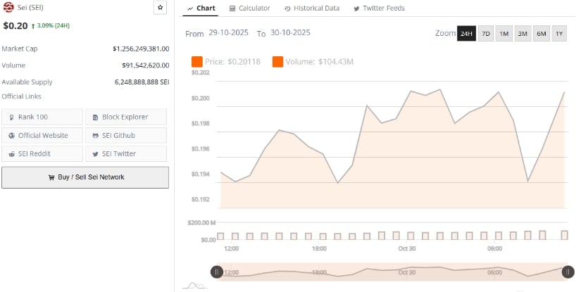 BraveNewCoin数据显示,SEI当前报价0.20美元,24小时涨幅3.09%,市值12.5亿美元,24小时交易量超9100万美元。此次回升标志着数周低迷交易后市场情绪改善。该代币流通量62.4亿枚,市值稳居加密货币前百。
