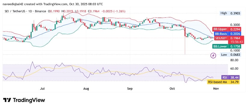 TradingView数据显示,SEI/USDT现报0.197美元,日内微跌0.96%。日线图显示代币在布林带下轨附近盘整,表明长期跌势后波动性降低。布林基线(20日均线)0.2026美元构成近期突破阻力位,而下轨支撑0.1758美元与分析师认定的宏观结构底部吻合。