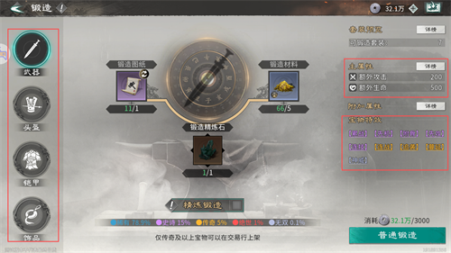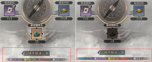 特殊的指定图纸可以锻造出对应套装的宝物,而普通图纸锻造的宝物则是随机套装。此过程中同样可以通过选择“精炼锻造”来提高出宝率。