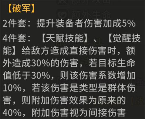 套装首选【破军】,2件套可以提升自身伤害,4件套可以提升天赋技能以及觉醒技能的伤害。
