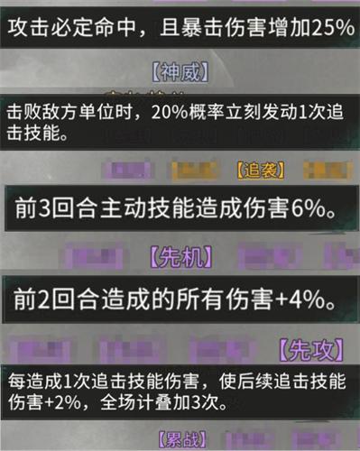 武器特效优先选择【神威】,金色可用【追袭】、紫色可用【先机】、【先攻】、【累战】