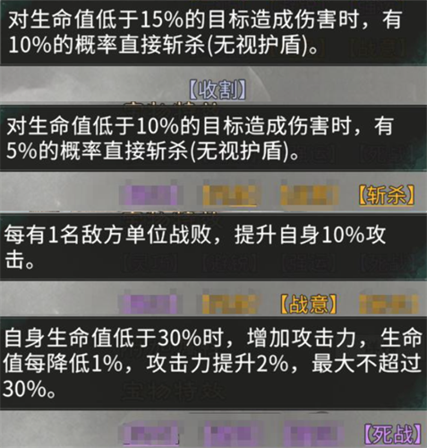 饰品特效优先选择【收割】和【斩杀】可以斩杀敌人,而自带斩杀的英雄(如:吕布、关羽)优先选择【战意】。紫色特效可选【死战】。