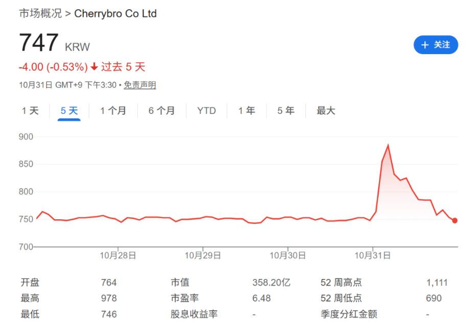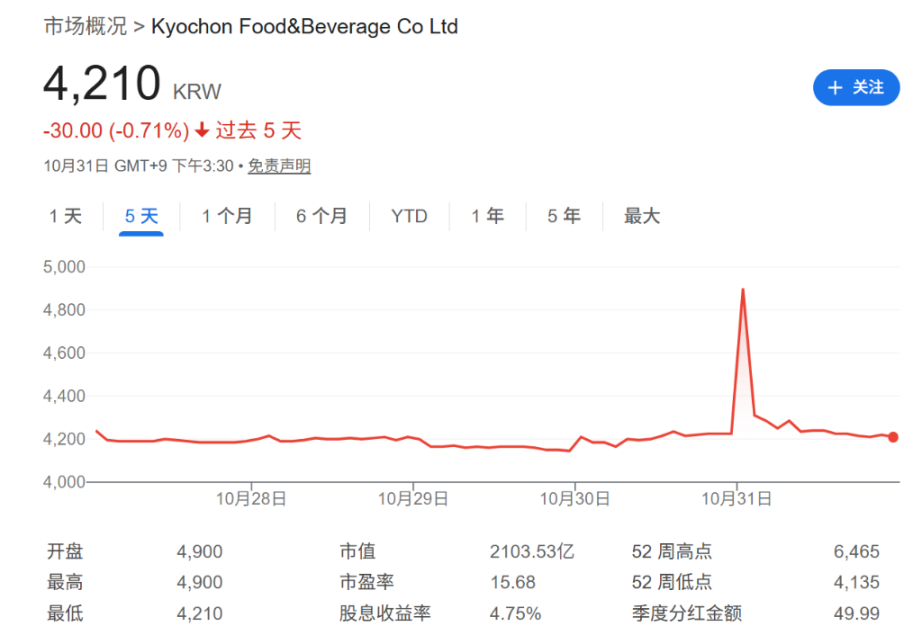 由于聚会地点 Kkanbu Chicken 未上市,寻求短期收益的交易者将目光投向了其他相关公司。炸鸡连锁品牌 Kyochon F&B Co. 的股价一度上涨 20%,而上游的家禽加工商 Cherrybro Co. 股价更是直接冲高至 30% 的涨停。