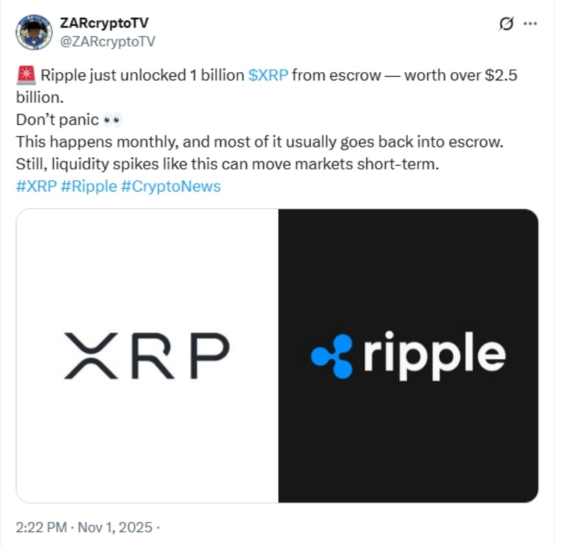 Ripple例行释放价值超25亿美元的10亿枚$XRP虽增加短期流动性,但大部分代币通常会重新锁定托管。来源:ZARcryptoTV via X