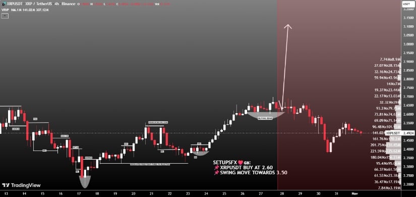 技术分析师与交易团队在XRPUSDT小周期图表中发现强烈看涨确认信号,提示波段买入机会。Team Setupsfx分析指出当前走势的主要上行目标为3.50美元,但强调若动能持续增强,价格可能"突破该区域"。