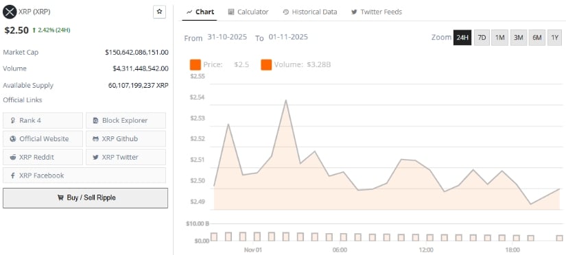 截至发稿,XRP交易价格约2.50美元,24小时上涨2.42%。来源:Brave New Coin