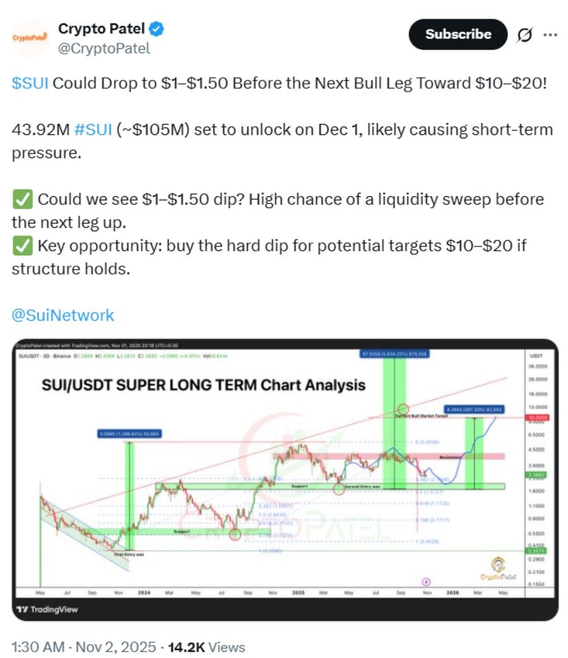4392万枚SUI解锁后,价格可能短期下探1-1.50美元区间,这或将成为看涨至10-20美元行情的买入机会。来源:@CryptoPatel via X