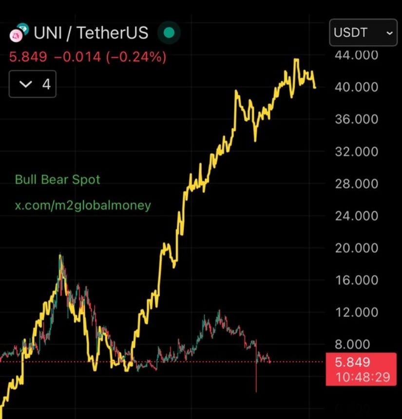 分析师Bull Bear Spot在最近的推文中强调,Uniswap与全球流动性趋势存在看涨相关性。该分析师指出,追踪全球流动性的M2货币供应量正急剧上升——这通常是加密货币等风险资产表现改善的前兆。与此同时,代币价格仍维持在5.80美元区间附近,被分析师称为"静默吸筹阶段"。