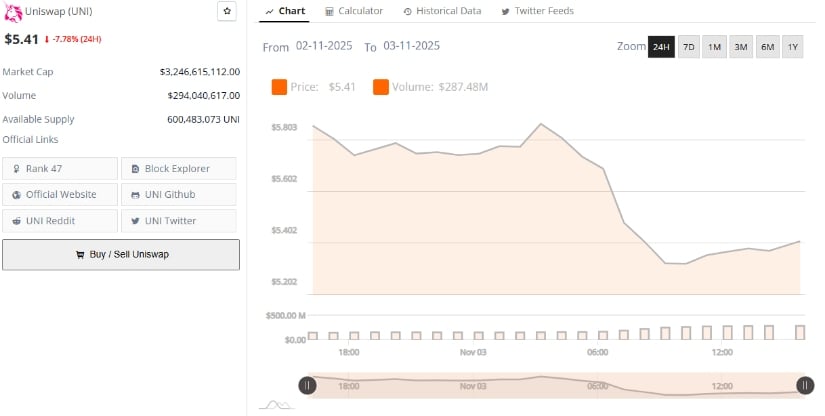 BraveNewCoin数据显示,Uniswap现报5.41美元,24小时跌幅7.78%。其市值32.4亿美元,日交易量2.9404亿美元。尽管短期疲软,价格仍稳固在5.40-6.00美元支撑区间,该区域历史上多次成为复苏基石。