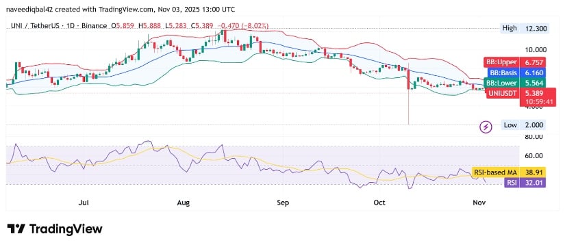 截至撰稿时,UNI/USDT交易于5.41美元附近,略高于5.57美元的布林带下轨。该交易对连续数周承受抛压,价格始终位于布林带中轨下方——表明空头仍占主导。但分析师强调,长期贴近下轨的状态往往在抛售动能衰退后迎来反弹或反转。