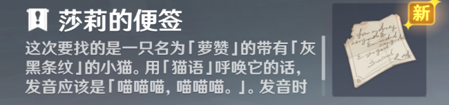 任务要求:依照“便签”中的要求,获取莎莉的三只小猫咪们的对应猫语,然后找到这三只小喵咪