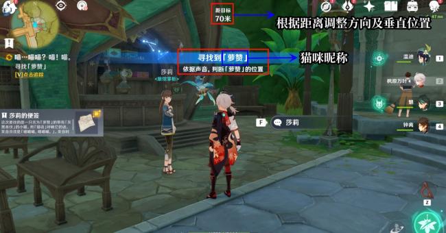大家在控制角色寻找小猫咪们的时候,在我们的主界面上部的UI正中央处,是会出现与小喵咪们距离的一个“距目标”提示的,根据这个距离提示,大家就可以清晰的了解到小喵咪们的具体方向了!