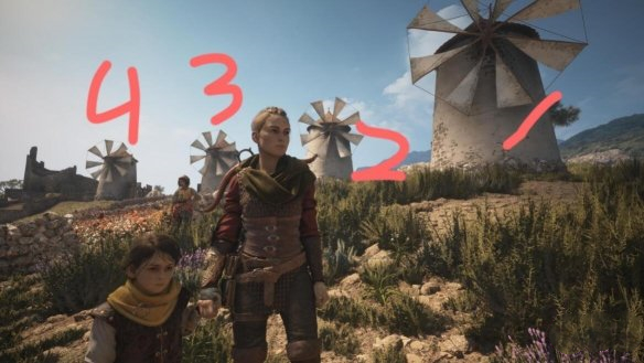 到达之后,玩家可以看到这里建有四座风车,依次将门打开,里面都会有材料可以拿走,前三个风车都会自己转,玩家可以选择将风车关掉,第四个风车在找到的时候就是不转的,玩家也可以选择让他转。