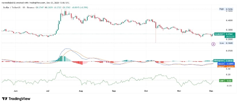 日线图上,XLM交投于0.2562美元附近,随大盘复苏微幅上涨。MACD线显现初步看涨转换迹象,当前-0.0091的MACD线正尝试上穿-0.0121的信号线。柱状图转绿,表明持续看跌动能可能转向早期企稳。