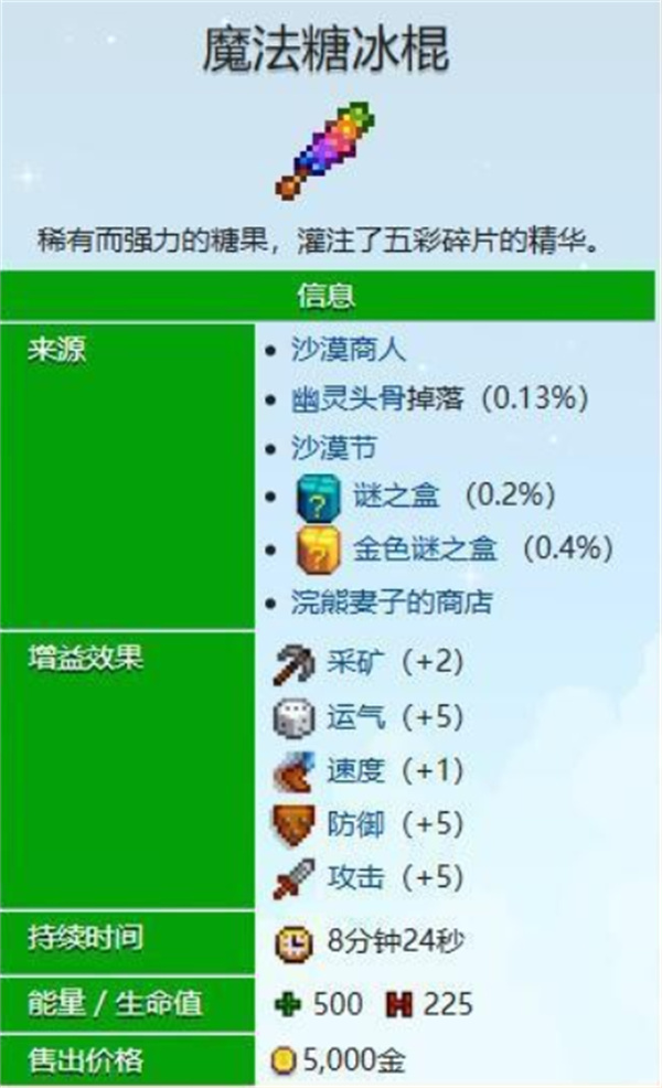 魔法糖冰棍:全方位增益,包含 +5运气、+1采矿、+1速度、+1防御、+1攻击。获取途径:沙漠商人处用3个五彩碎片兑换,或哈维的好感事件购买。