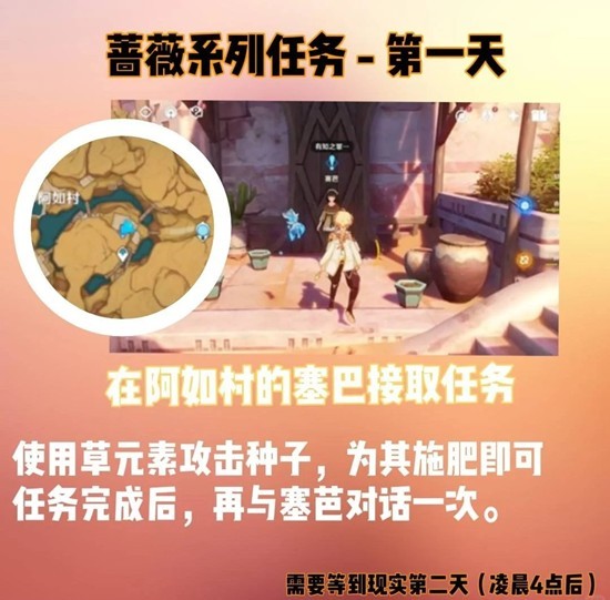 第一天:与赛芭对话,提交一朵须弥蔷薇,然后获得一些种子,使用草元素将其施肥