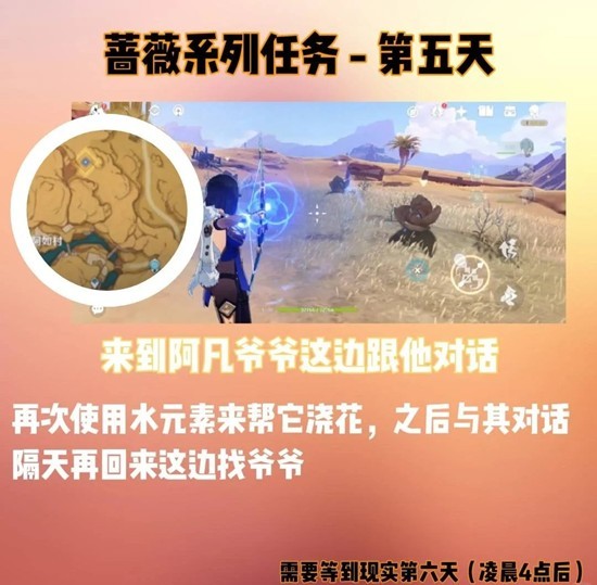第六天:与爷爷对话,跟着任务指引找到手记,把他阅读完毕,传送回阿如村找塞芭对话,再传送回爷爷这里与爷爷对话,帮他把石头花击碎(使用大剑角色),再使用草元素将其施肥