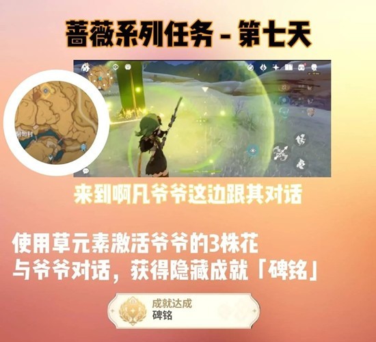 第七天:与爷爷对话,用草元素将其施肥,再与爷爷对话,获得隐藏成就「碑铭」