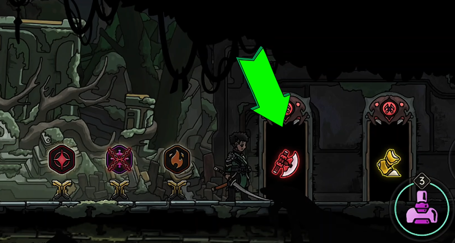 如果前两个房间没有刷到技能的话,就退出重进,也就是说这两个技能是开荒第一阶段的核心,没有这两个技能,刷图效率会很低,拿到这2个技能后到感知房间拿这个技能,到强化房间拿这个技能,这4个技能都到手后,初始角色几乎可以做到无限释放技能,再通过技能触发飞羽打伤害,从而实现无限循环,这个套路不管是清小怪还是打boss的效率都有,除此之外大家也可以优先进强化房间拿取跟飞羽相关的boss,也就是说开荒第一阶段以飞羽为核心搭建套路的话是大家的游戏体验都不会太差。