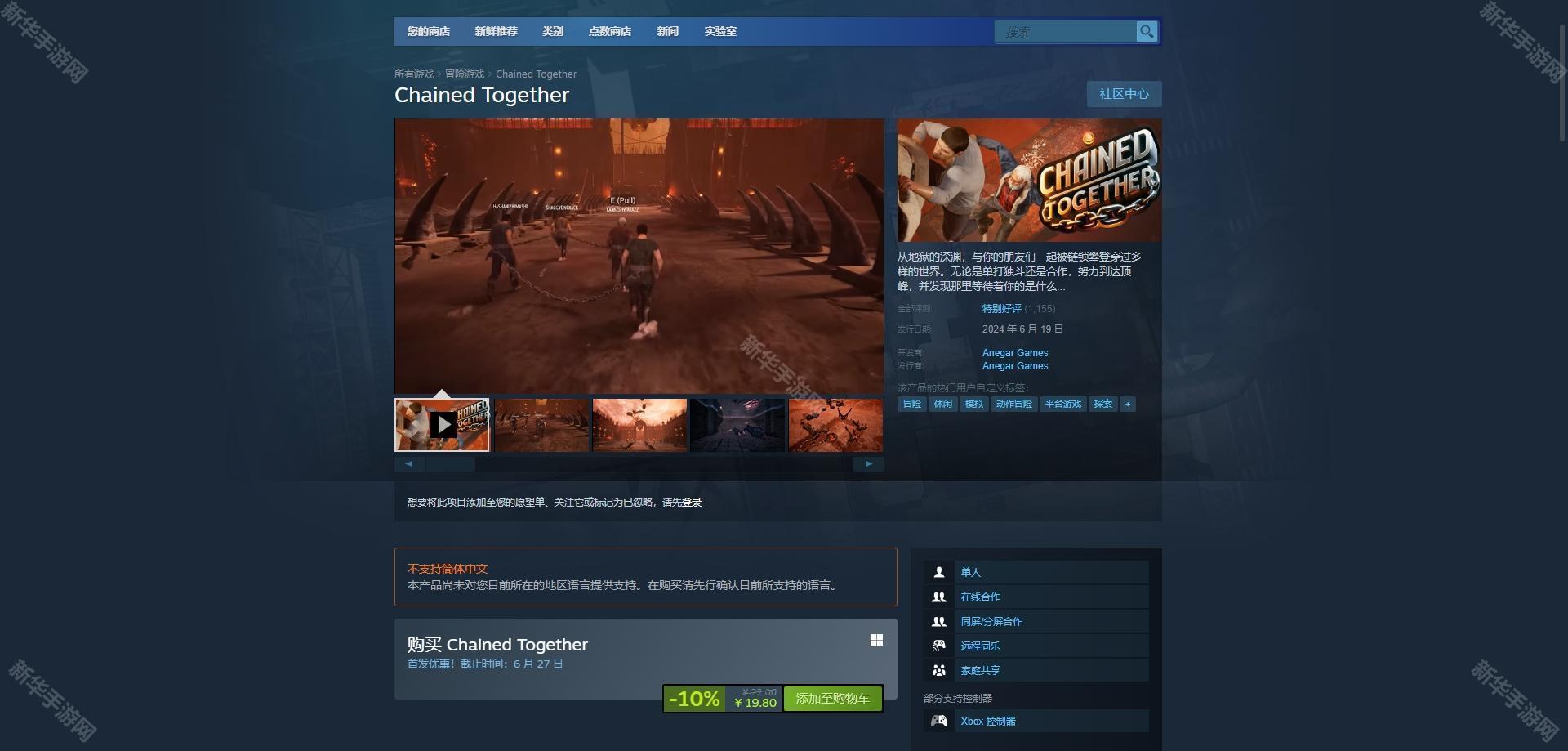 Chained Together中文名叫链在一起,它是Steam最近刚刚上线的一款多人受苦向动作冒险类游戏,也被称为四人成行。它有点类似于之前爆火的“Only UP”,不同的是它需要你像“Pico Park”中那样,将所有游戏中的玩家用一条绳索串联起来。游戏还配备了极为真实的物理引擎,这意味着你与其他被串联的玩家会相互影响,只要有一人出现一点小小的失误,都有可能将你们所有人一起带入深渊。这虽然会大幅增加游戏的难度,但也就是这种需要多人协同合作的玩法,让游戏过程中充满了更多的欢乐,不过这也有可能让你快速红温。这款游戏目前已于6月19日上架Steam商店,首发优惠仅需19.8元就能享受其中的乐趣,不过游戏不支持中文,所以下面就由新华给大家教学一下游戏的联机步骤以及下载方式。