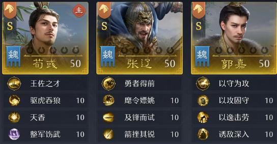 技能配置方面,荀彧主战技推荐王佐之才、驱虎吞狼、天香与整军饬武,强化其谋略输出、减益施加及团队增益能力;张辽侧重突击压制,搭配勇者得前、麾令嫖姚、及锋而试与箭挫其锐,提升单体爆发与先手压制效率;郭嘉则聚焦战术调度,采用以守为攻、以攻固守、以逸击劳与诱敌深入四技,构建多层状态干扰链,有效触发溃散、雷雨等关键负面效果。