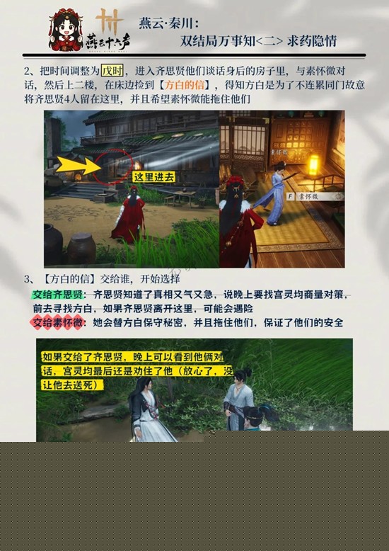 【方白的信】交给谁,开始选择交给齐思贤:齐思贤知道了真相又气又急,说晚上要找宫灵均商量对策,前去寻找方白,如果齐思贤离开这里,可能会遇险交给素怀微:她会替方白保守秘密,并且拖住他们,保证了他们的安全