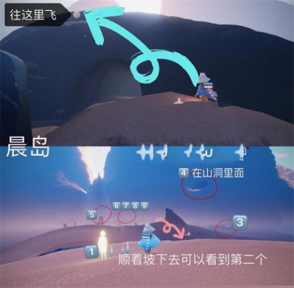 4、第四个需要先获取第三个后,顺着云层飞到山顶,穿过隧道进入山洞寻找。