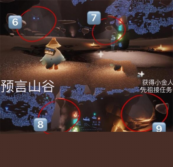 6、其余4个小金人分布在石台下方的一个平台上,向右前进可见入口,通往预言山谷。该区域的小金人需完成特定任务才能解锁。