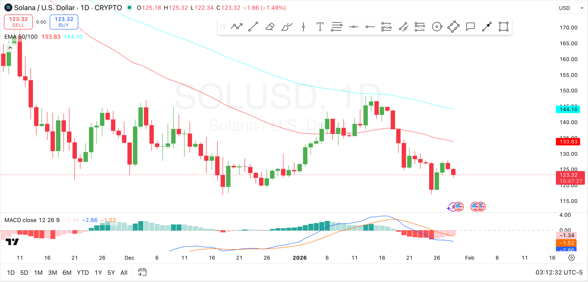 TradingView数据显示,Solana技术指标目前呈现看跌信号。其价格已跌破50日(133.83美元)与100日(144.10美元)指数移动平均线。