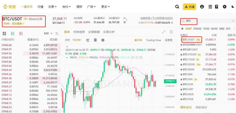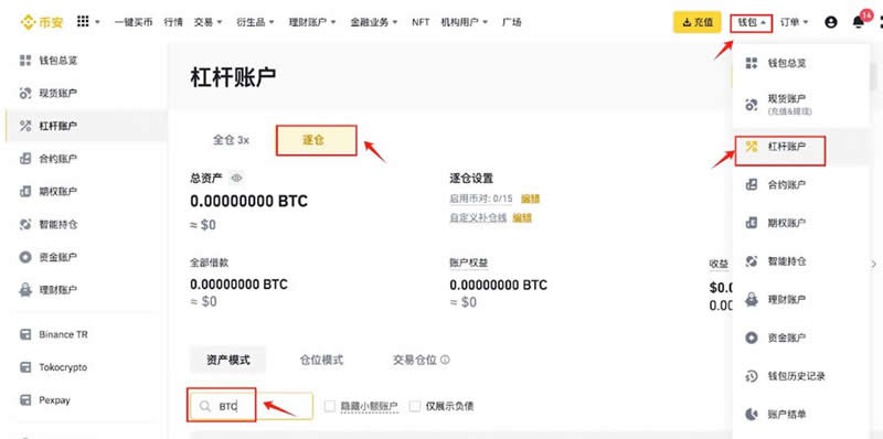 2、切换至【逐仓】选项卡,选定BTC/USDT交易对。