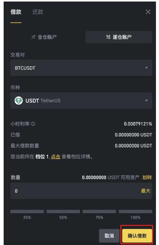6、在借款窗口中选择对应币种及借款数量,完成借款确认。