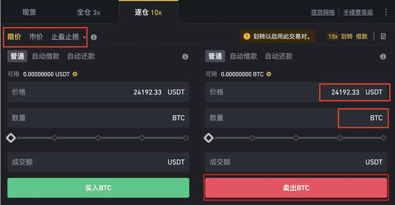 7、若预判市场下行,可借入数字资产高价卖出后低价购回偿还。操作时选择订单类型与【普通】交易模式,输入具体参数后执行卖出指令。