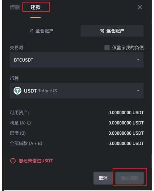 9、切换至【还款】页面,选择相应币种与还款数量完成确认。
