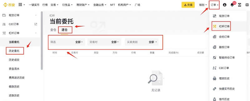 11、在【订单】-【杠杆订单】界面可查询历史委托记录,支持多维度筛选。