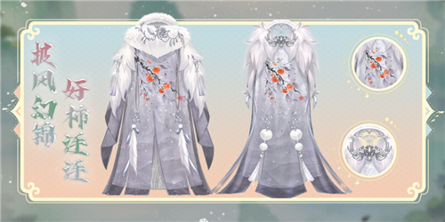 洁白丰盈的毛领轻裹肩颈,披风之上,一株柿子树盈盈舒展,枝头坠满圆润可爱的柿子,宛如点点暖灯缀入夜色。衣摆随风轻扬时,柿果仿佛随风轻颤,寓意着好事接连、岁岁丰年,为少侠披上一身锦绣吉祥。