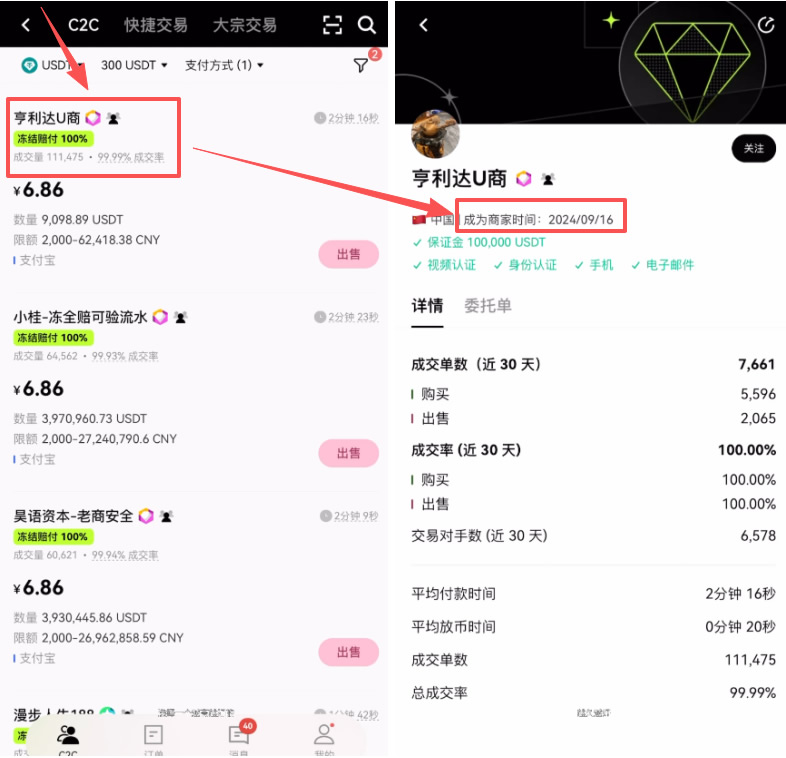 成交量与成交率:越高越好。注册时间:点开商家主页查看,必须选择注册时间超过 1 年的老商家。存活时间久证明其资金来源相对安全,风控记录良好。