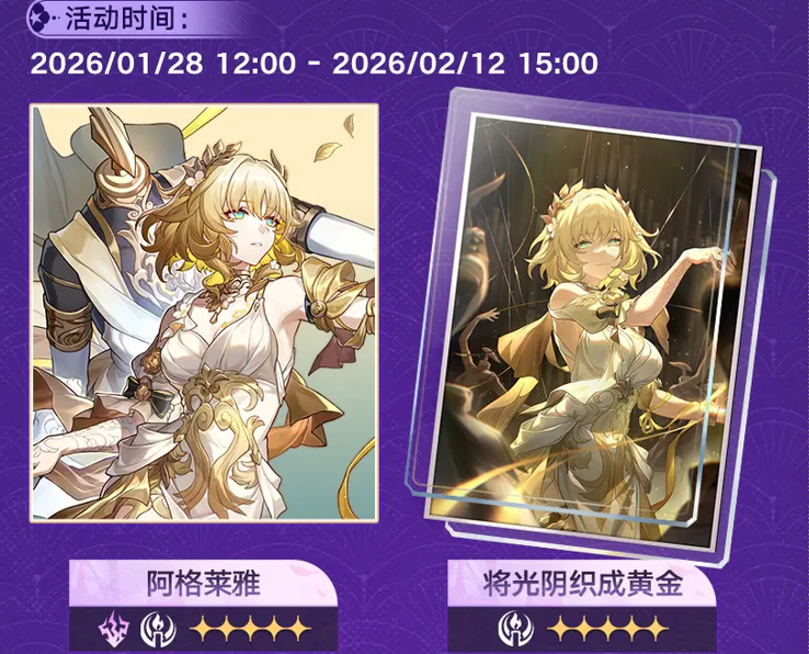 《崩坏:星穹铁道》3.8版本第三期活动跃迁将于2026年1月28日12:00至2月12日15:00开启。期间限定五星角色阿格莱雅(记忆·雷)、星期日(同谐·虚数)及多款限定光锥获取概率大幅提升,同期四星角色与光锥也将限时UP。