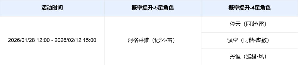 限定5星角色「阿格莱雅(记忆•雷)」「星期日(同谐•虚数)」,4星角色「停云(同谐•雷)」「驭空(同谐•虚数)」「丹恒(巡猎•风)」跃迁成功概率限时提升。