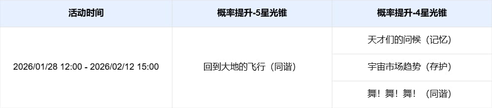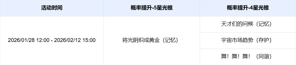 限定5星光锥「将光阴织成黄金(记忆)」「回到大地的飞行(同谐)」,4星光锥「天才们的问候(记忆)」「宇宙市场趋势(存护)」「舞!舞!舞!(同谐)」跃迁成功概率限时提升。
