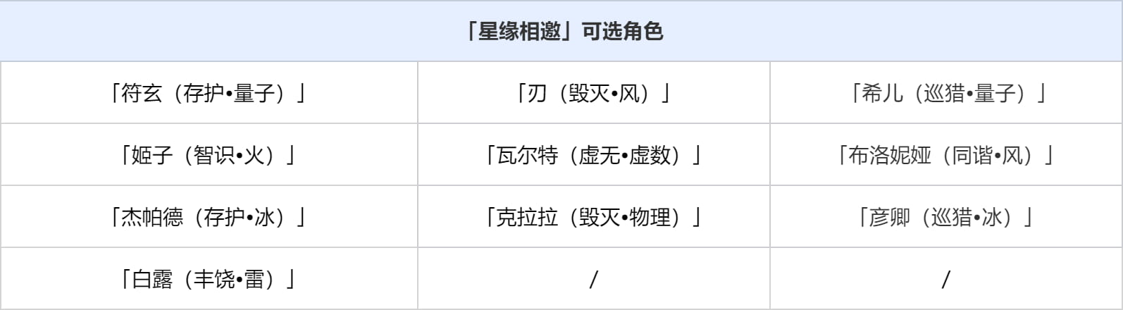 ● 开拓者可自定义角色活动跃迁中7名「星缘相邀」角色,可选列表如下。
